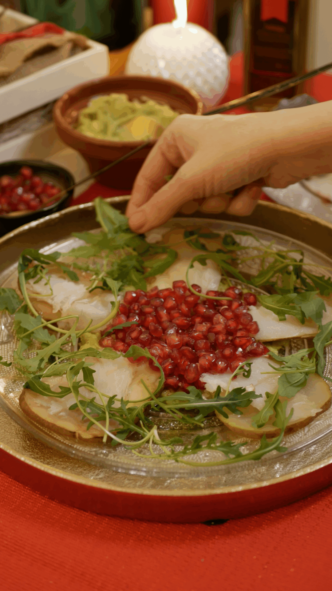 - Montar el carpaccio con las rodajas de pera en forma de flor y poner en el centro la crema de aguacate, como topping poner las pepitas de granada y la rúcula.