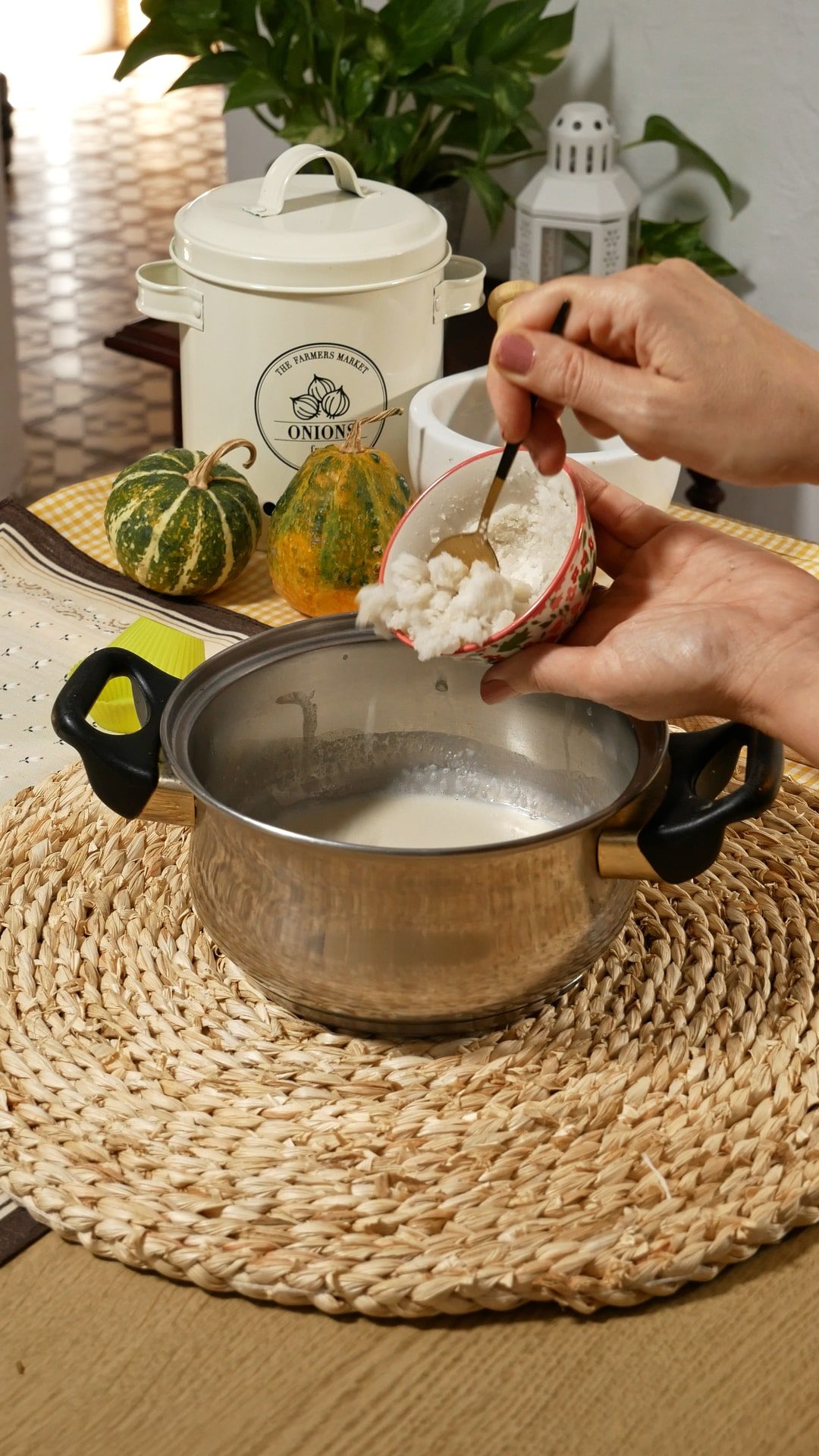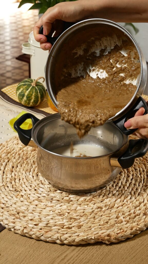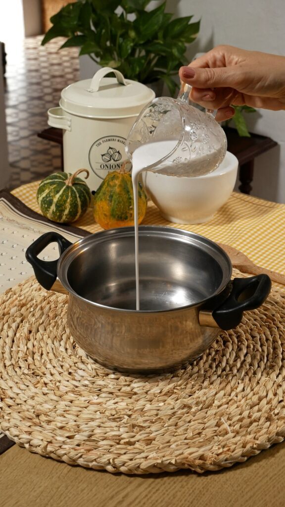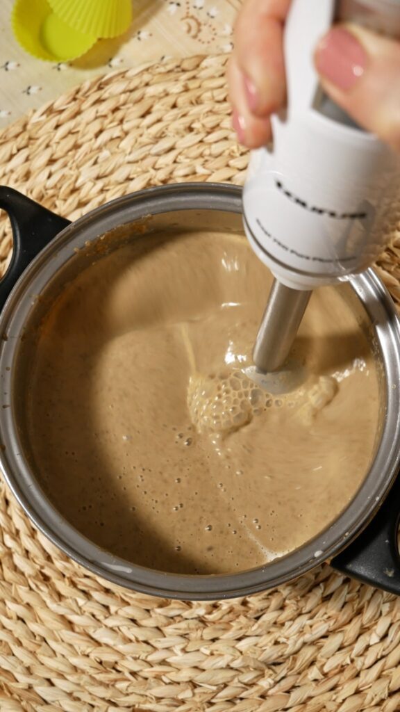 - Añade la leche de coco con la gelatina al cazo con el resto de la leche o nata y remueve bien para integrar todo. No es necesario que hierva, solo que esté caliente.