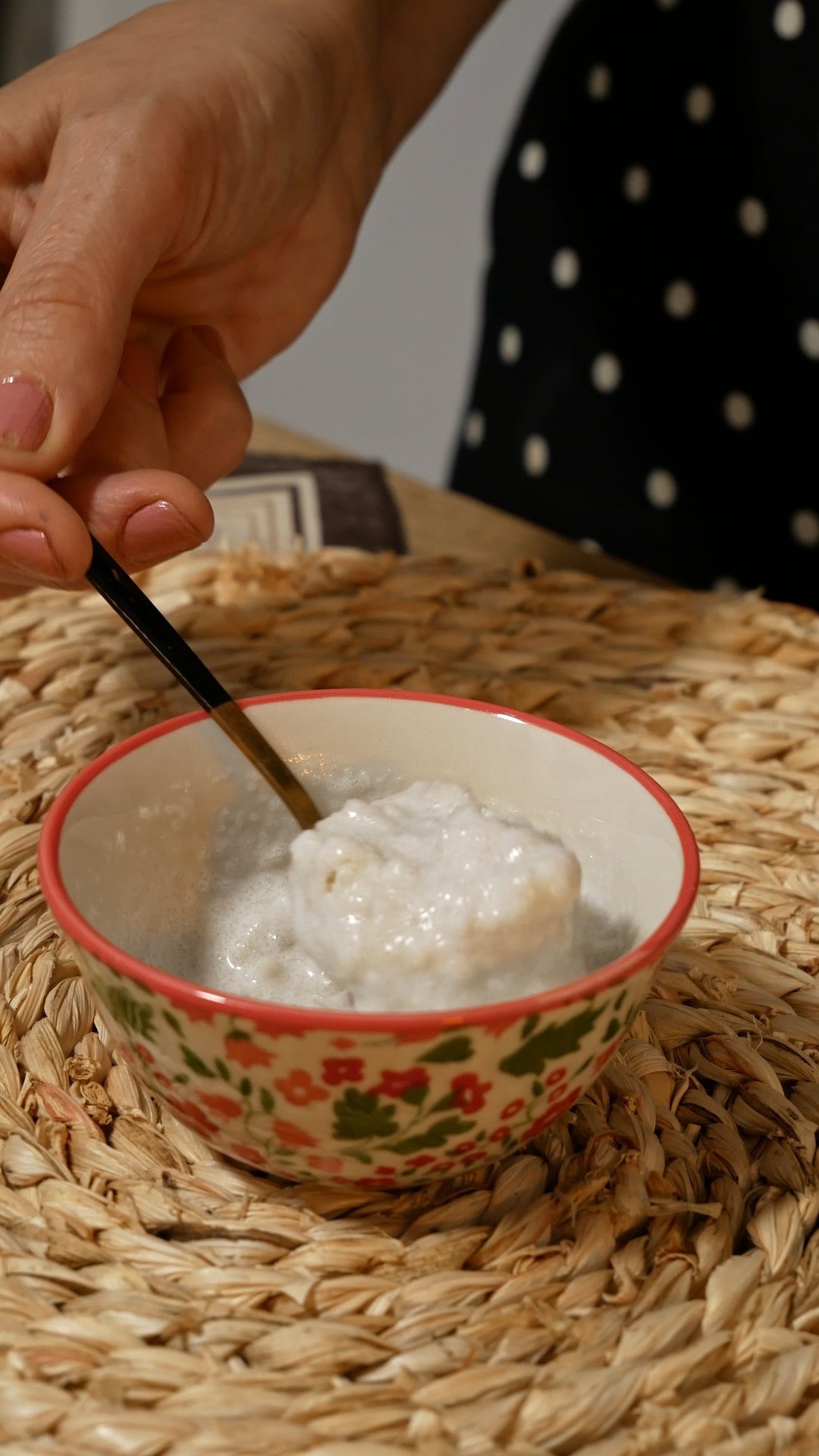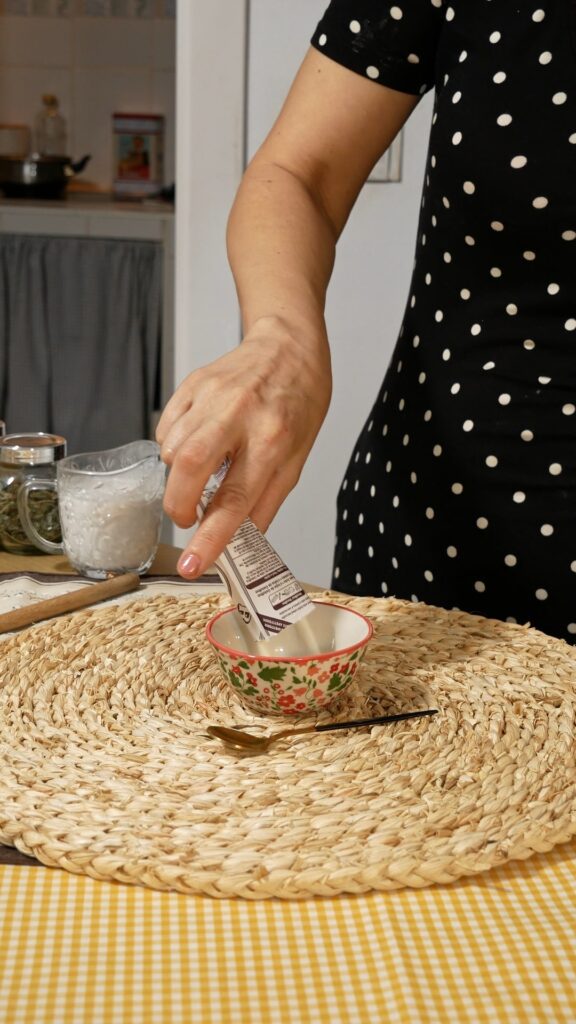 - Primero, ponemos la gelatina dentro de 100 ml de leche de coco o nata