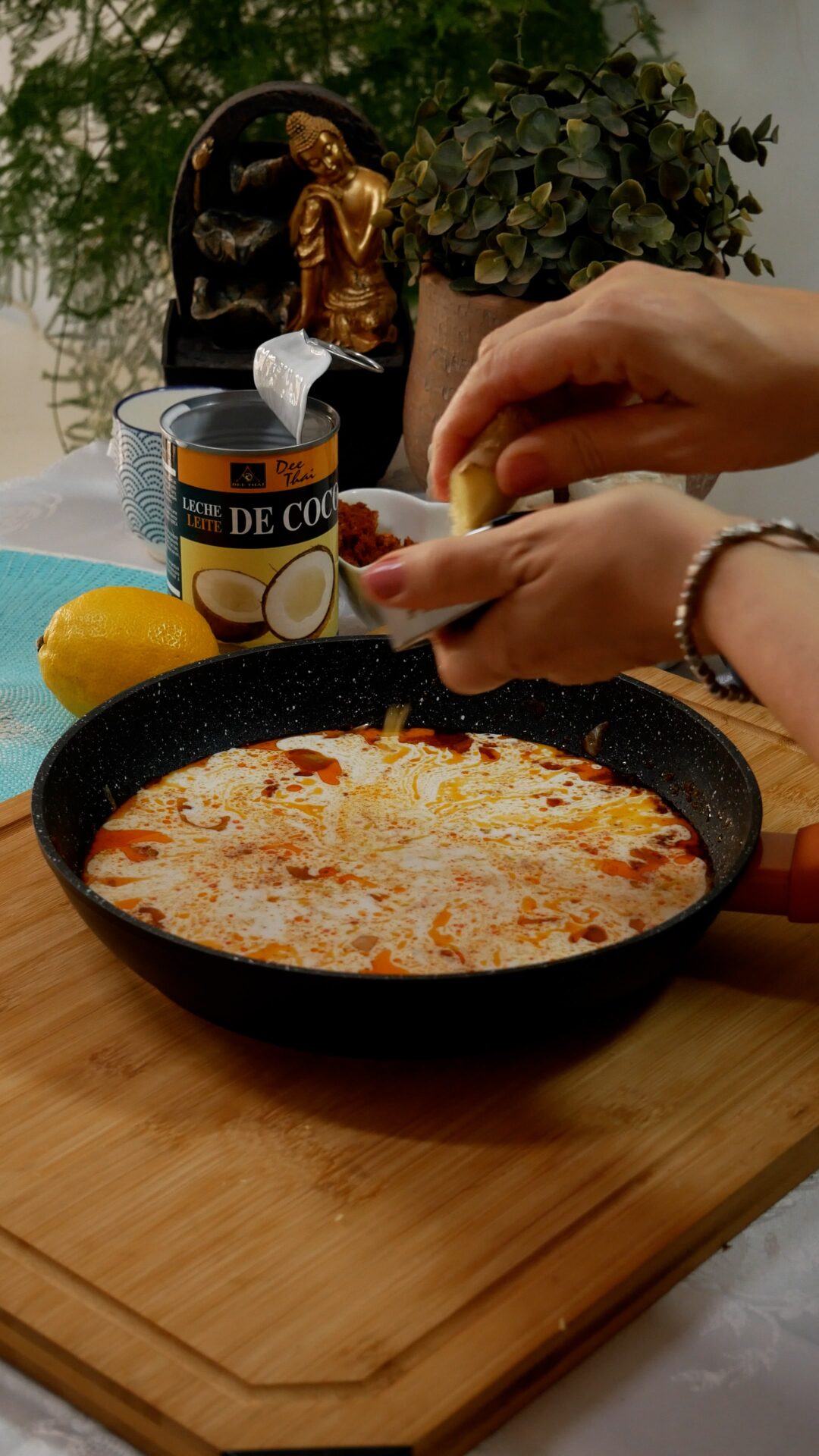 - Agregar la leche de coco, medio vaso del jugo de la cocción de los mejillones, la ralladura del limón y el jengibre y remover bien. Dejar cocinar unos diez minutos a fuego medio.