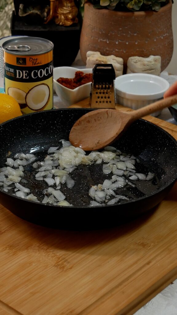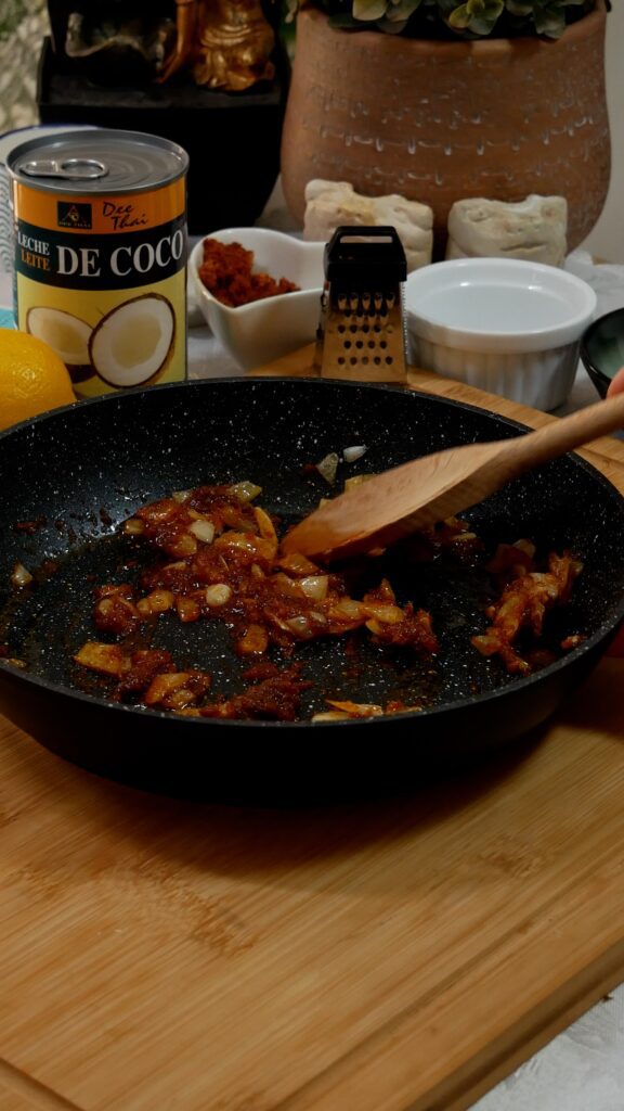 - Ahora es el momento de añadir la pasta de curry a la sartén y remover para que se deshaga con el calor.
