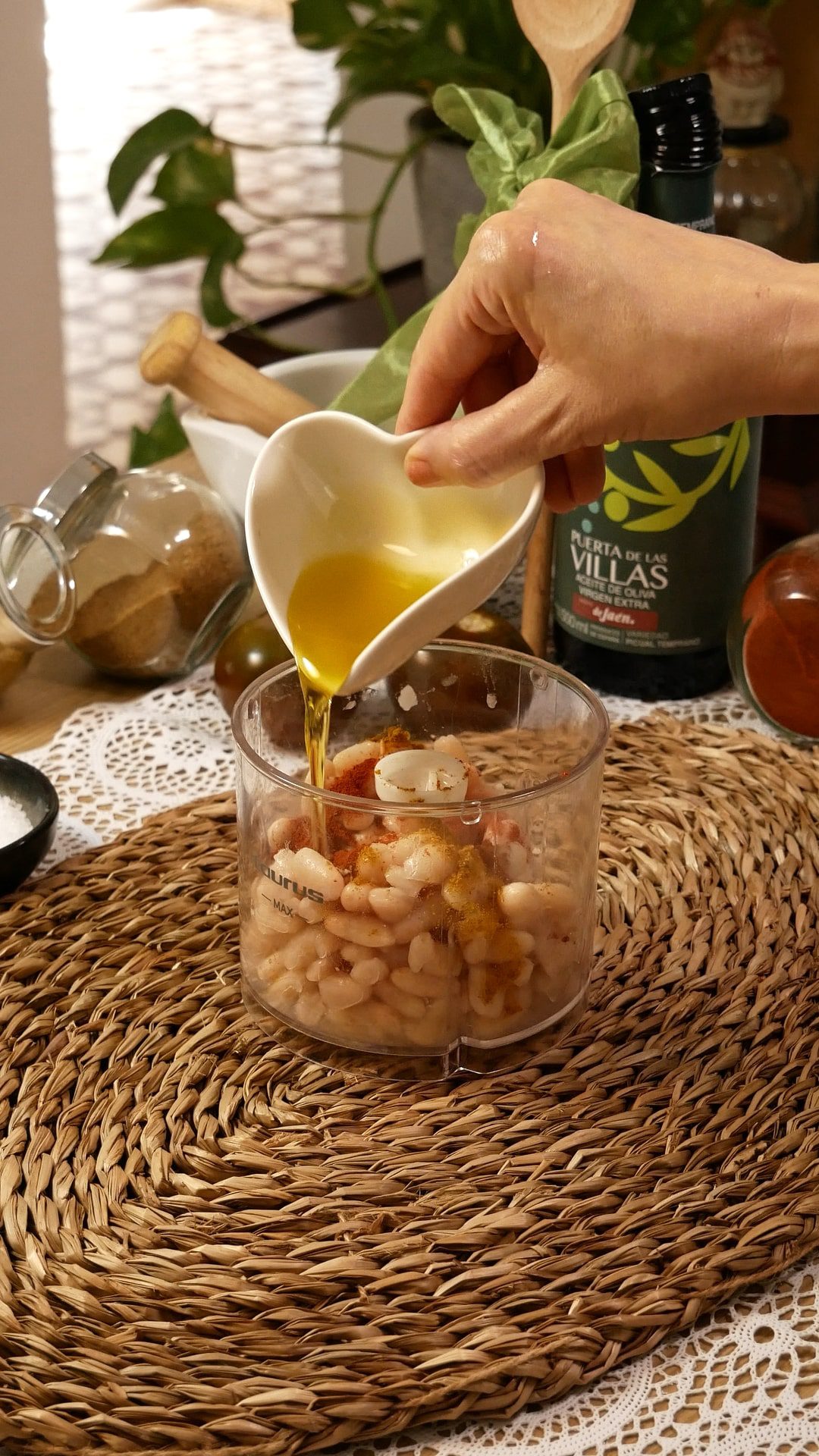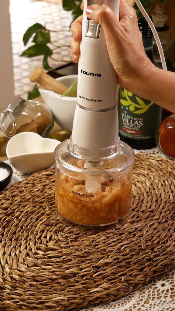 - Mientras se hacen las verduras, enjuagamos las alubias y las ponemos en la tritutadora junto con 2 cucharadas de aceite, la cúrcuma, el pimentón, el ajo y un poco de sal. Procesamos hasta obtener una crema homogénea.