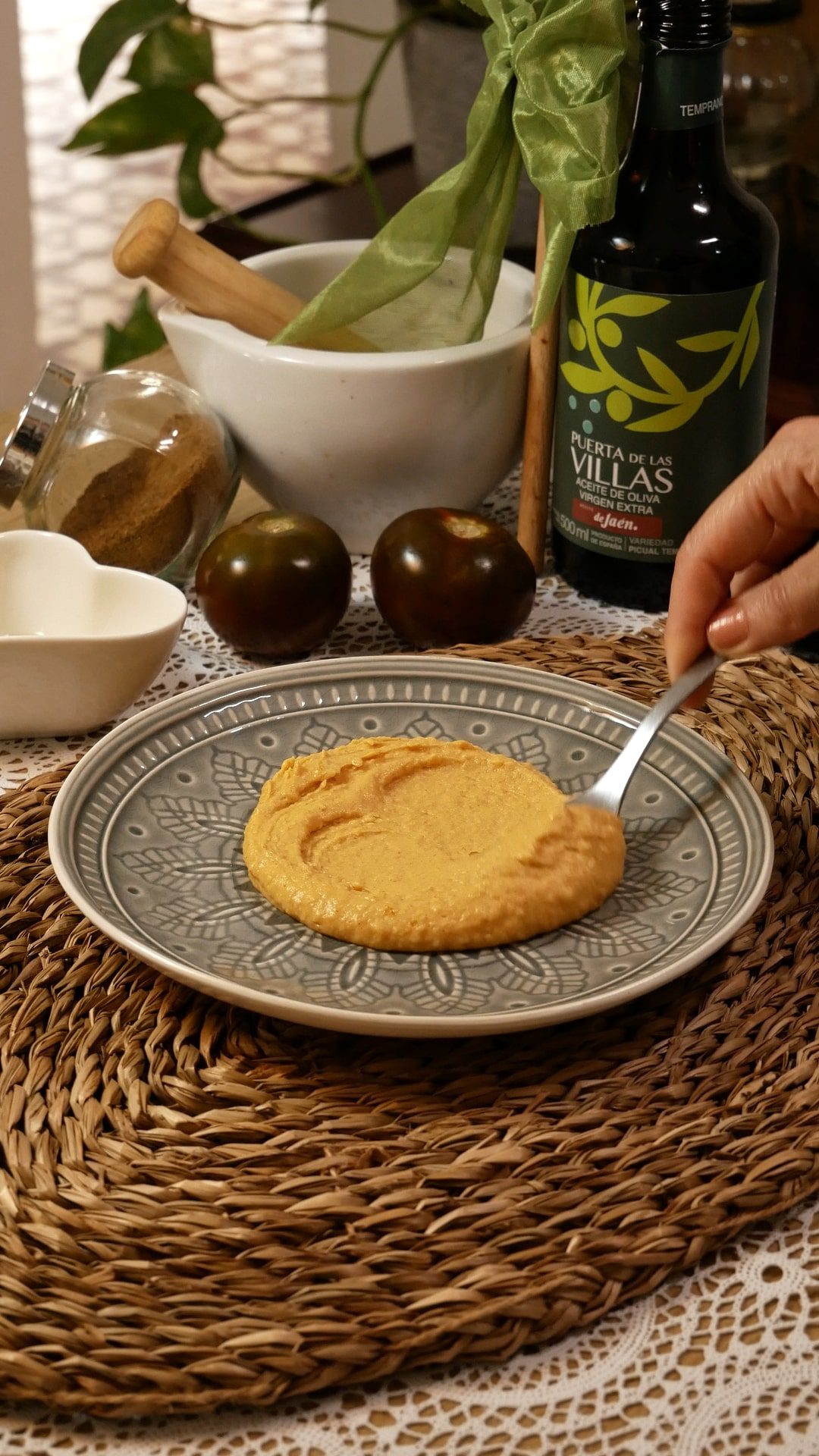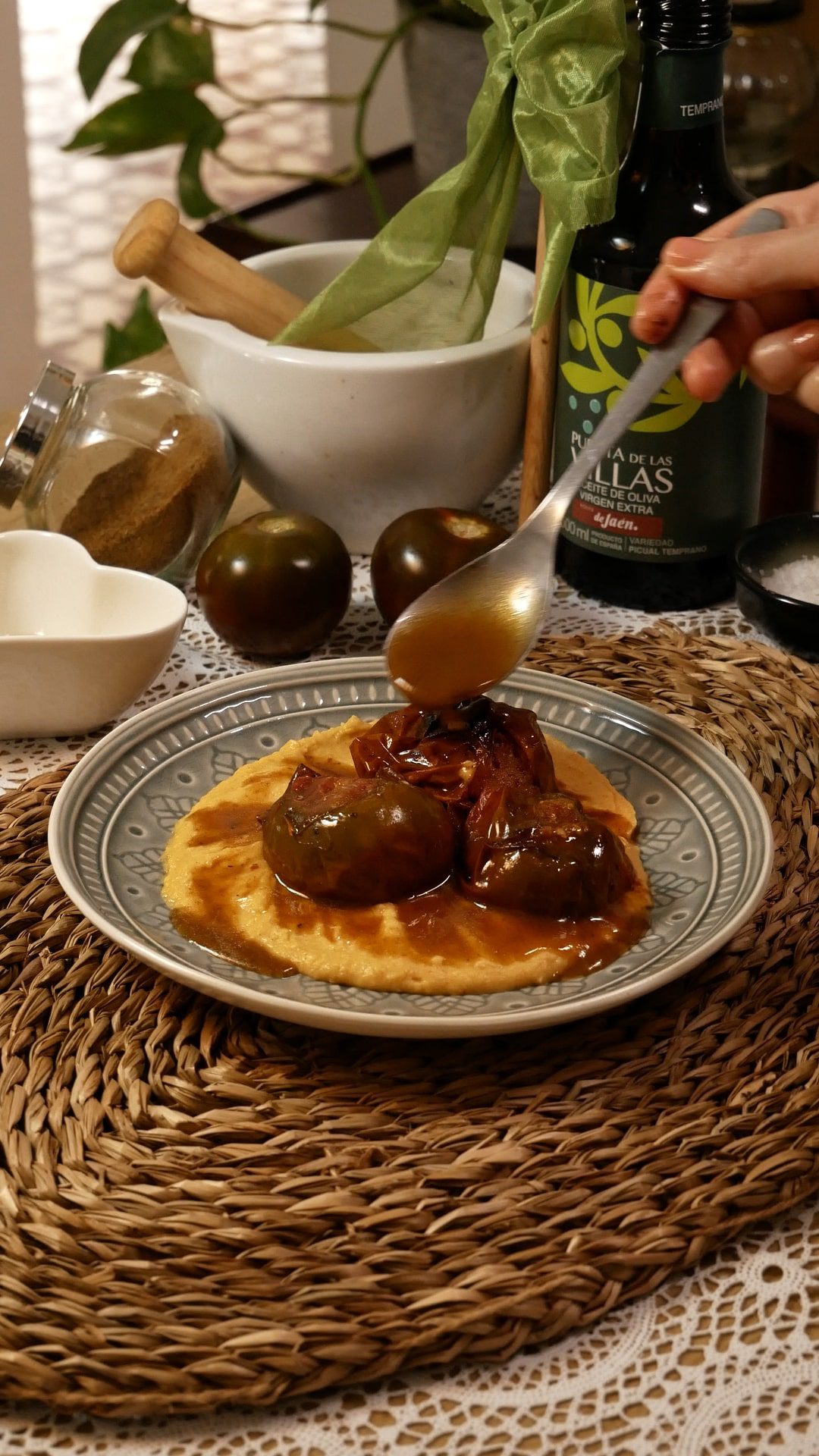 - Finalmente, extender el hummus de alubias sobre el plato y colocar los tomates encima. Rociar con la salsita de especias.