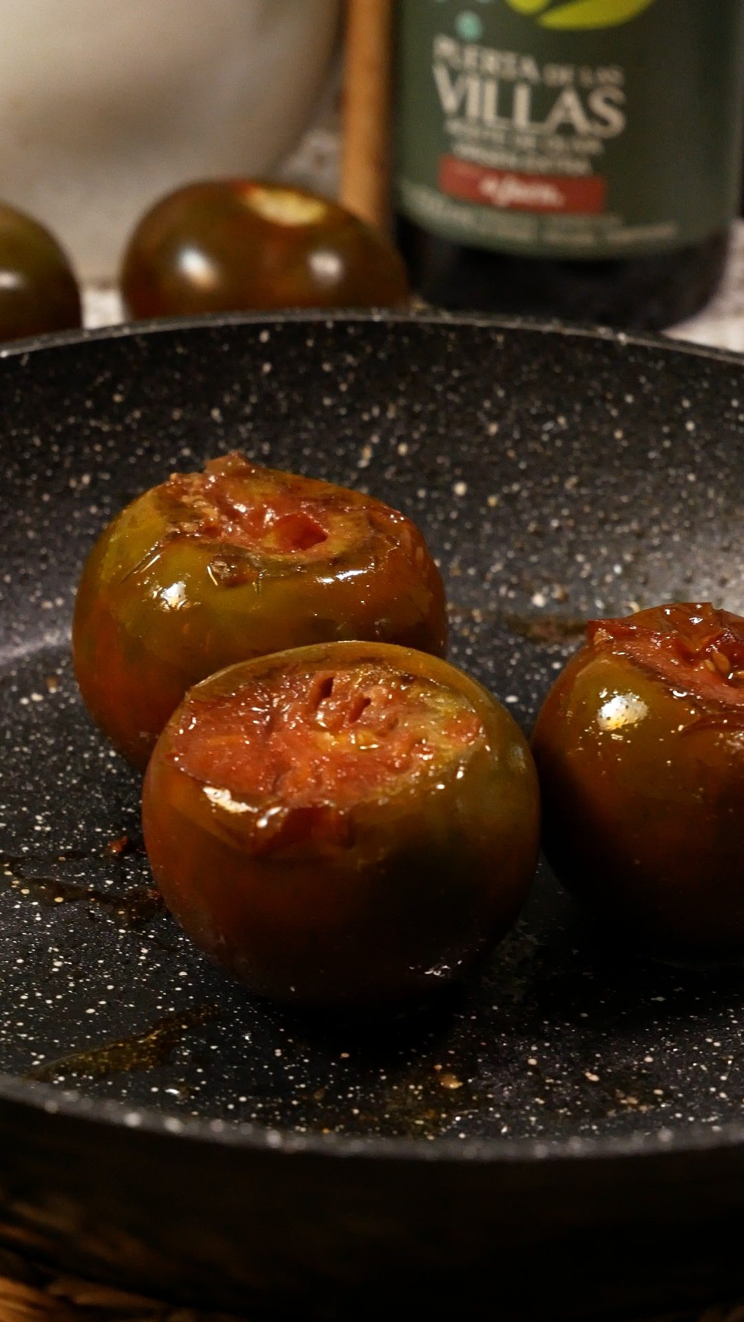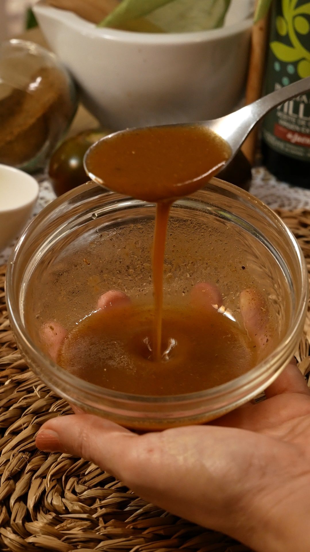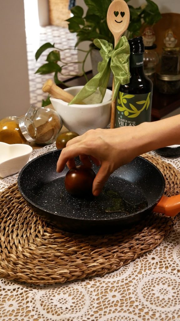 - Verter el jugo que han soltado las verduras en un cuenco. Agregar dos cucharadas de aceite, comino, romero y pimienta negra. Batir y emulsionar.